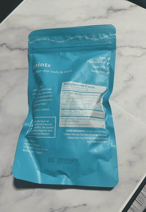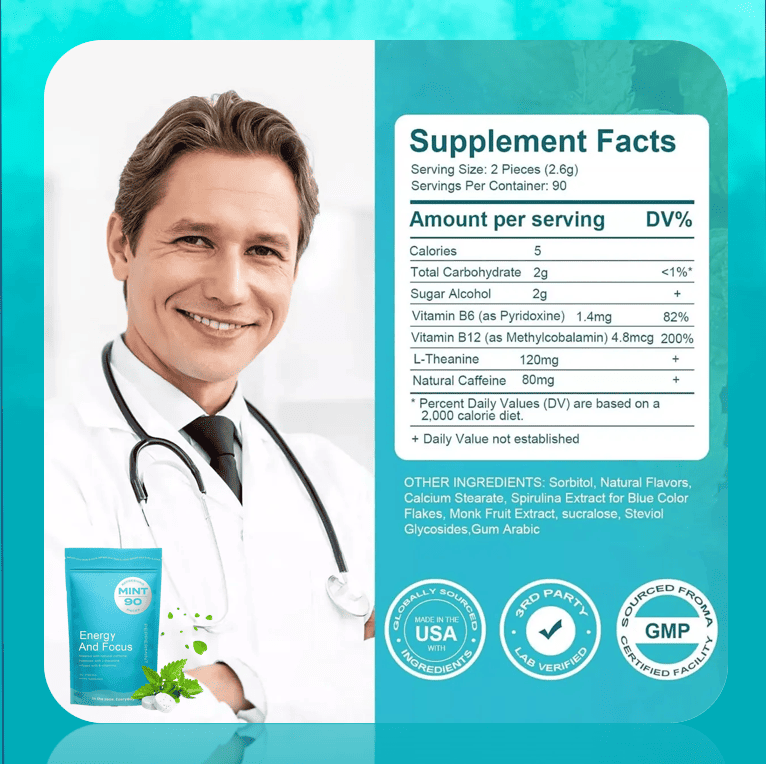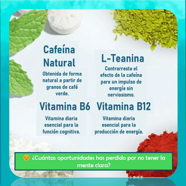 Energy & Focus™ es una menta nootrópica con cafeína natural, L-Teanina y vitaminas del complejo B, diseñada para darte energía mental y claridad cognitiva al instante, sin nerviosismo ni caídas de energía.
