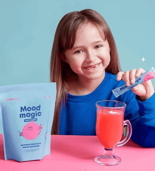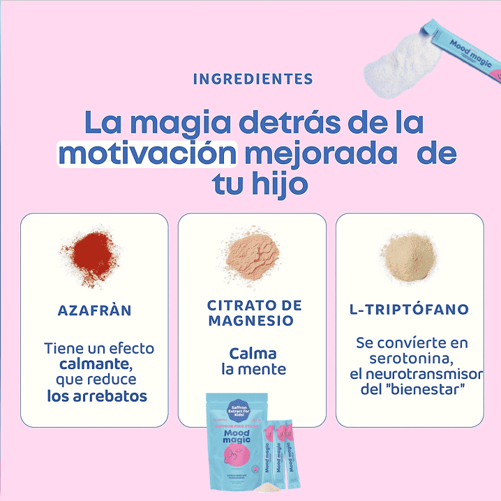 MoodMagic™ es un suplemento natural en forma de sticks saborizados que combina azafrán, magnesio y L-triptófano para apoyar el equilibrio emocional, la concentración y el bienestar general de niños y adolescentes.